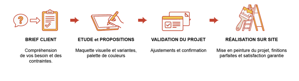 Notre processus de création de fresque murale est simple et transparent. Nous commençons par un brief créatif pour comprendre vos besoins. Ensuite, nos artistes élaborent une maquette visuelle pour validation. Puis nous procédons aux ajustements nécessaires. Enfin, nous intervenons sur site pour réaliser votre fresque murale dans les délais convenus.